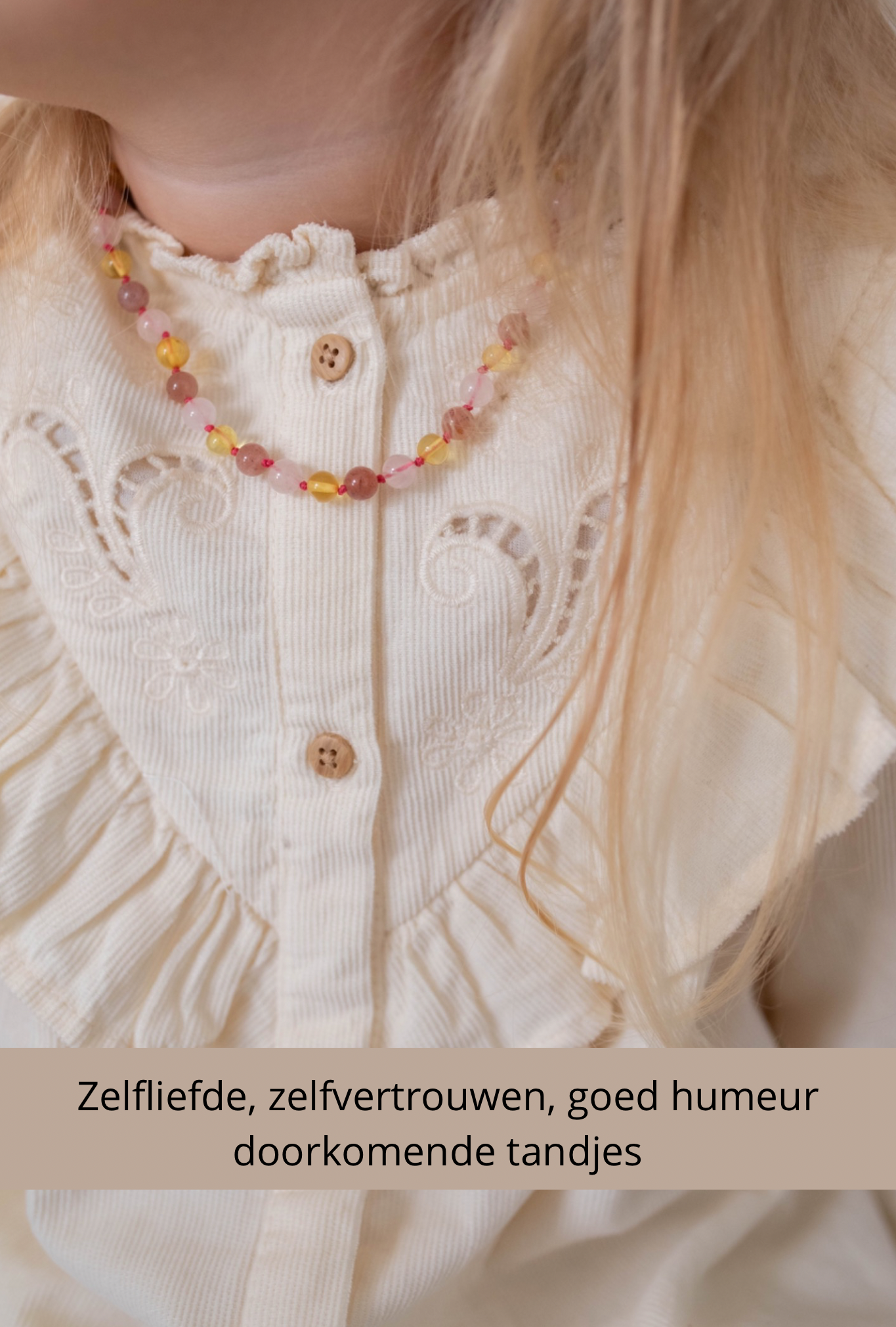 Rozenkwarts, de steen van de liefde. Het heeft een liefdevolle, warme en zachte energie die zorgt voor een veilige, rustige en liefdevolle sfeer. In dit geval voor zelfliefde en naaste liefde. Deze edelsteen zorgt er voor dat je je beter kan open stellen voor je gevoelens. Ideaal als kraamcadeautje!