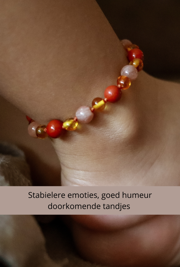 Veel moeders zweren bij de verzachtende werking van barnsteen voor hun baby bij het doorkomen van de tandjes. Dit armbandje is met de hand gemaakt. Na iedere barnsteen zit een knoopje om te voorkomen dat de losse steentje ingeslikt kunnen worden mocht de armband breken.