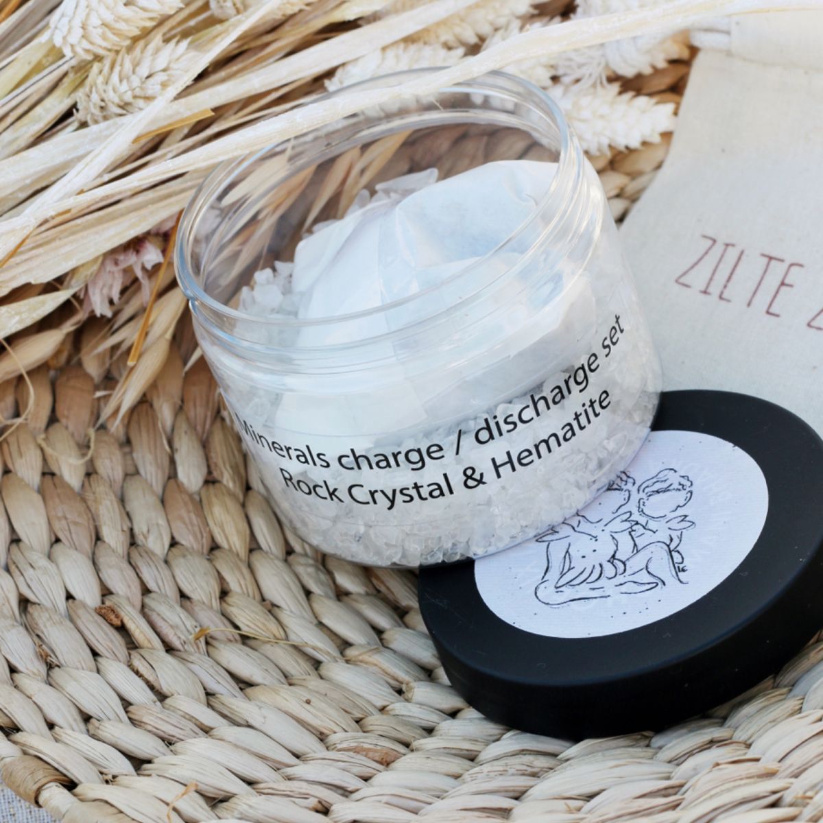 Ontlaad-/oplaad set van 100 gram Hematiet en 100 gram Bergkristal. Deze hoeveelheid is voldoende voor het opladen van kleinere items, zoals een hanger, armband, trommelsteen of knuffelsteen, oorbellen, mobiele telefoonhanger of (kleinere) ruwe edelstenen.